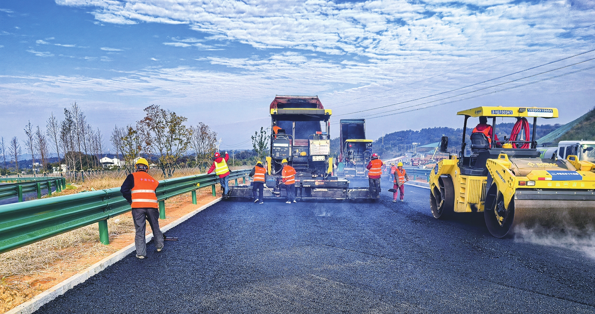图为先锋路至杨家店段主线路面沥青摊铺工作加速推进。 (记者熊小磊 摄)