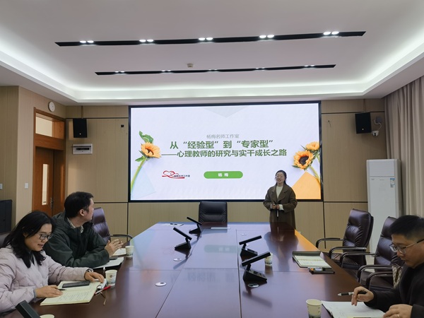 为进一步深化心理健康教育研究,提升教师队伍专业素养,11月27日,在宜都市教师发展中心与市教研室的指导下,杨梅名师工作室成功举办了以“专业内训,助力成长”为主题的心理健康教育进校园活动。全体工作室成员齐聚宜都一中,围绕心理健康教育的前沿议题与实践经验展开深入交流,为校园心理健康教育工作注入了新的动力。