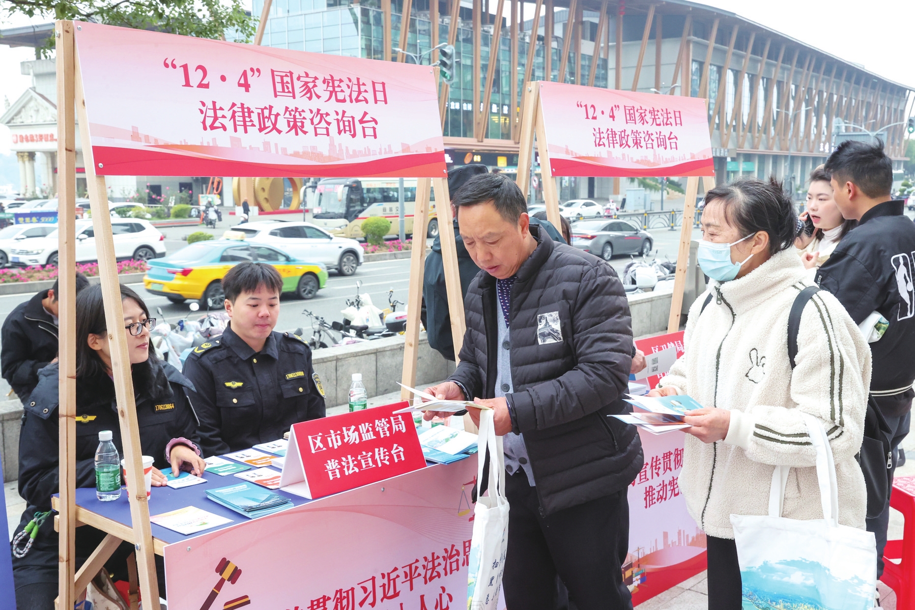 12月4日,伍家岗区在万达广场举办国家宪法日普法惠民活动。现场多家单位设点,为市民提供面对面的法律政策咨询,解答卫生、就业等热点问题,让法治精神更贴近群众生活。(记者周卓然 摄)