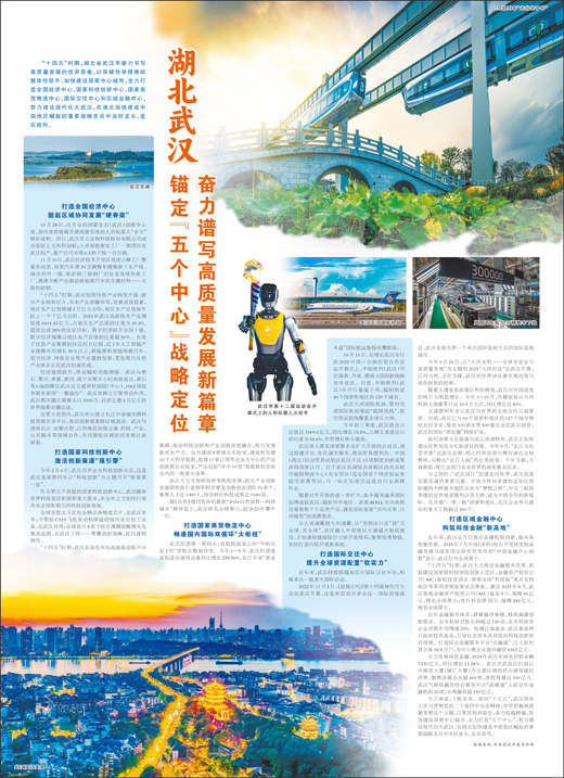 “十四五”时期,湖北省武汉市奋力书写高质量发展的优异答卷,以突破性举措推动整体性跃升,加快建设国家中心城市,全力打造全国经济中心、国家科技创新中心、国家商贸物流中心、国际交往中心和区域金融中心,努力建设现代化大武汉,在湖北加快建成中部地区崛起的重要战略支点中当好龙头、走在前列。