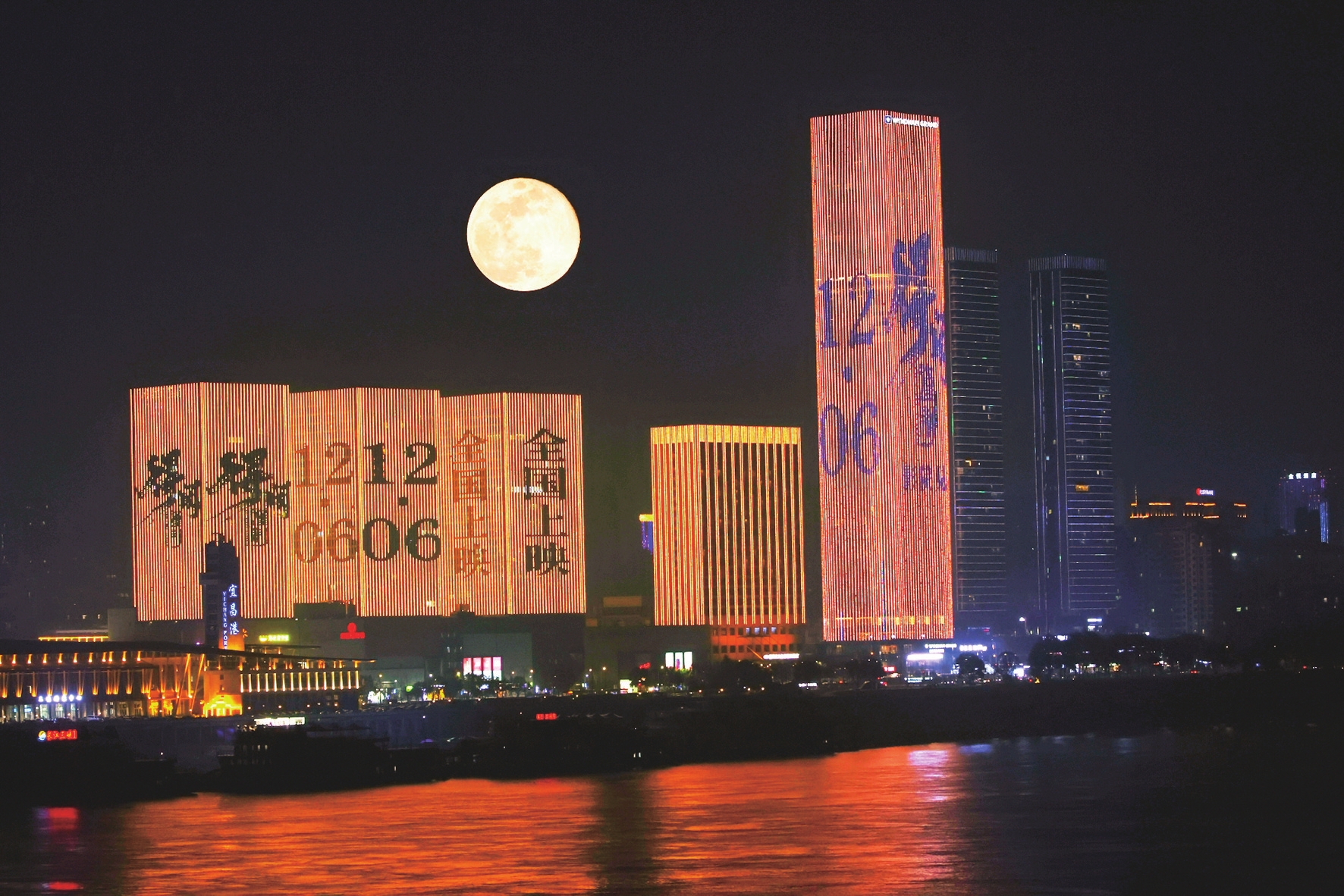 12月5日,皓月当空。宜昌江畔齐亮灯,祝贺电影《得闲谨制》12月6日全国上映。(记者吴延陵 摄)