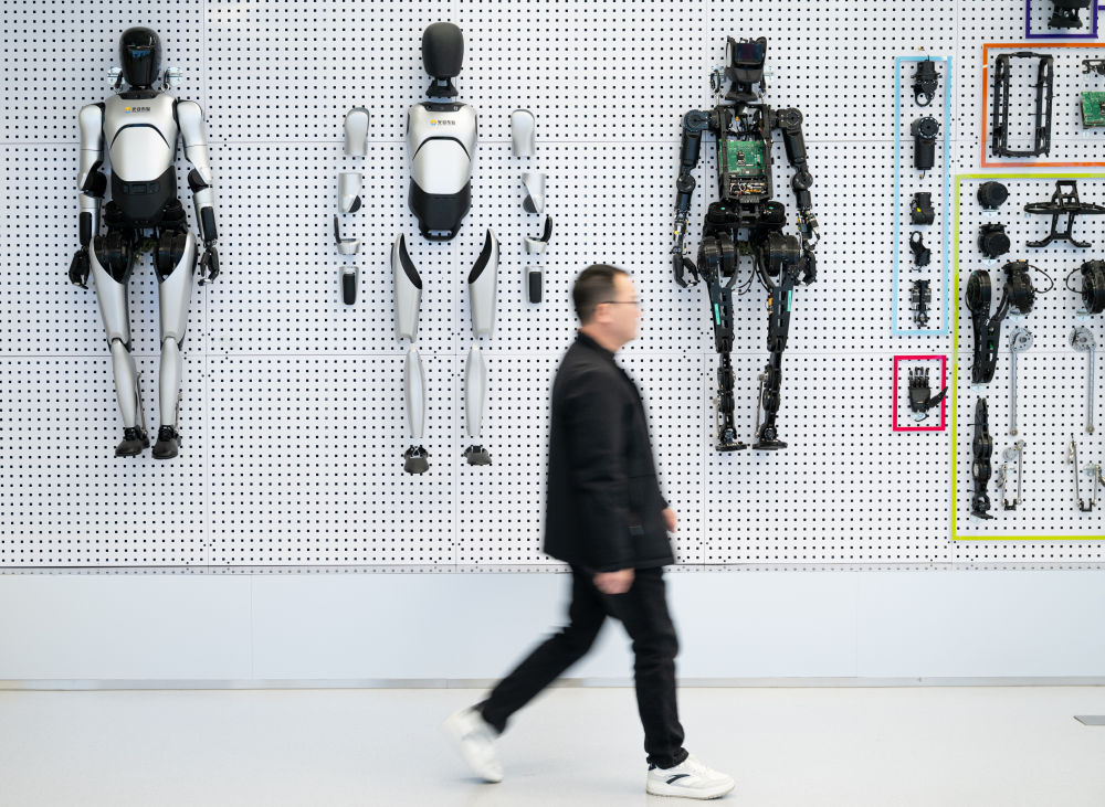 ↑ 12月4日,在湖北人形机器人创新中心,工作人员对人形机器人进行调试作业。