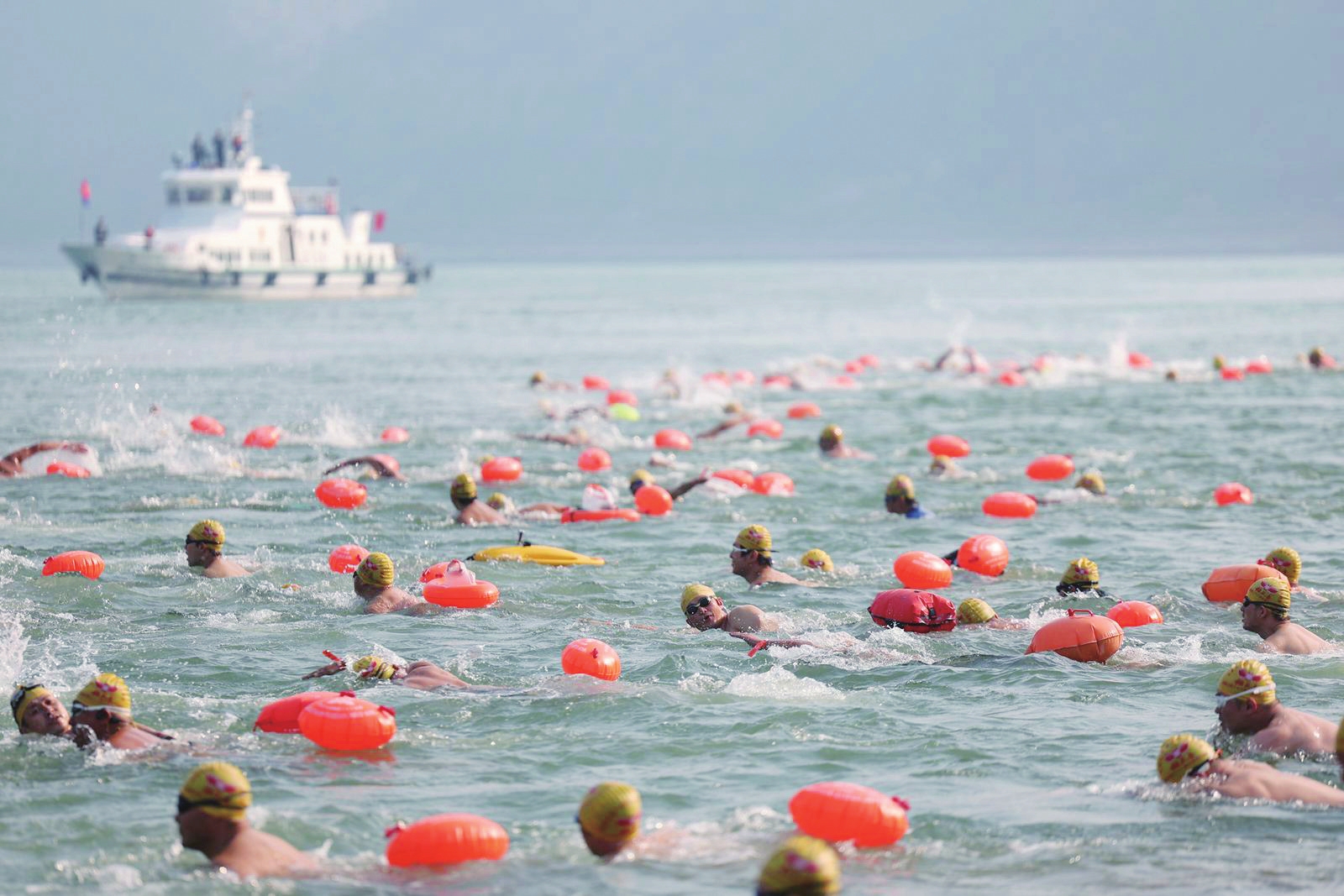 12月6日,点军区樱桃园江段,冬泳爱好者正在比赛中。当日,宜昌市第十届冬季长江抢渡赛暨第三十八届畅游长江活动举行,来自全国近千名冬泳爱好者齐聚宜昌江段,迎着浪花你追我赶、奋力拼搏,感受长江之美,点燃冬日激情。(记者黄翔 摄)