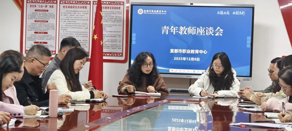 为助力青年教师快速成长,12月8日,宜都市职教中心组织召开青年教师座谈会。学校纪委书记兼工会主席熊兴艳、各年级组主任与29名青年教师齐聚一堂,以书为媒分享感悟,以教为题共话成长。教务处副主任毛晓莲主持会议。