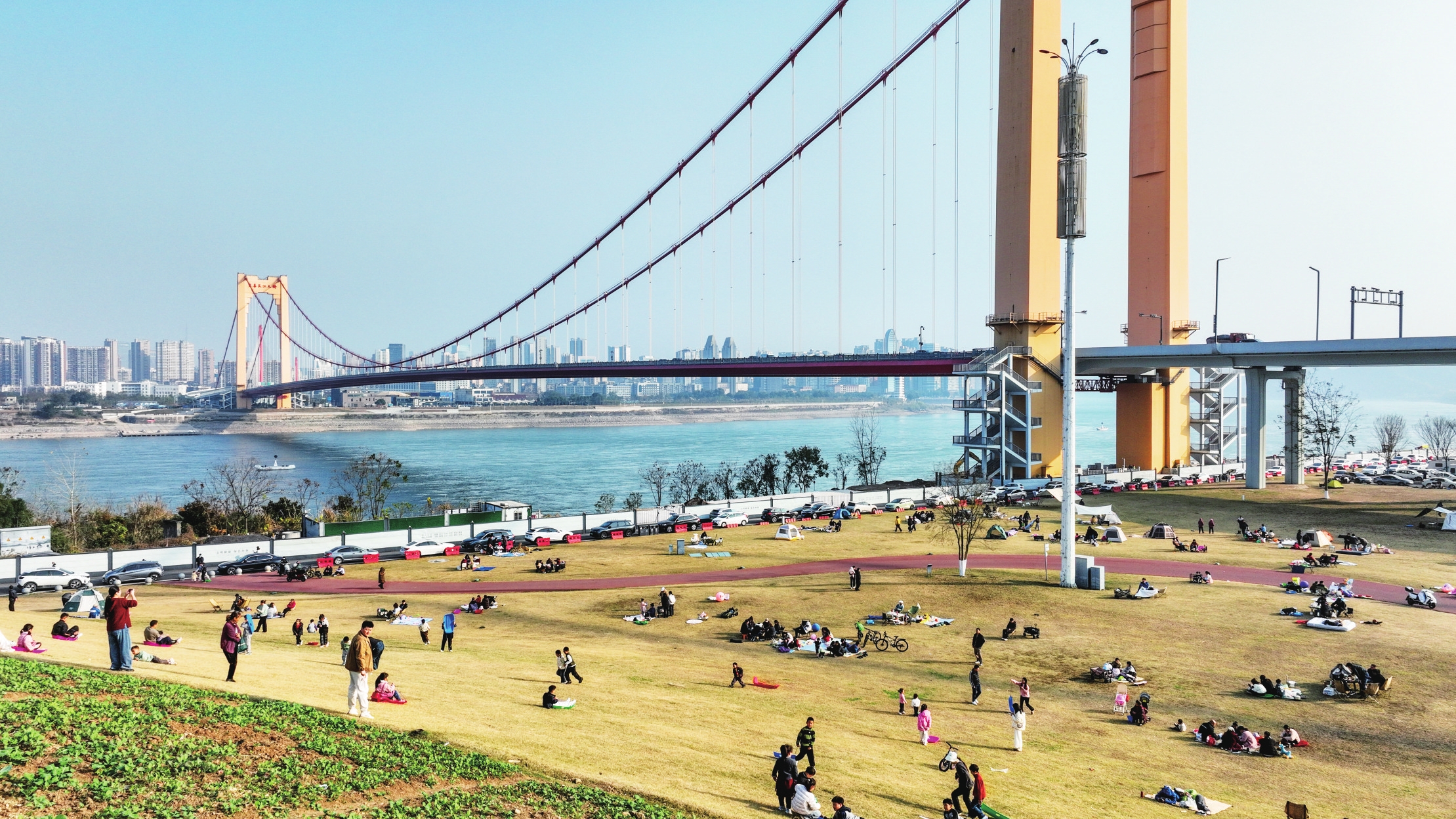 12月14日,宜昌城区至喜大桥南岸桥头,市民们正享受冬日暖阳下的户外乐趣。缓坡上,孩子们在家长的陪伴下,欢笑着体验滑草。远处,雄伟的至喜长江大桥如长虹卧波,与沐浴在阳光中的宜昌城市共同勾勒出一幅诗意图景。这片开放空间已成为市民亲近自然、休闲观景的热门选择。(记者林潇 摄)
