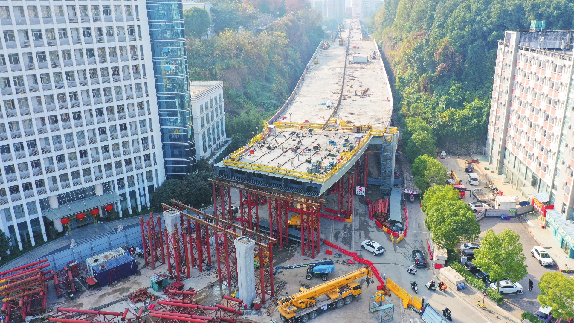 12月15日,宜昌城区胜利三路延伸段快速路高架正在加紧建设。目前,体育场路至城东大道段、城东大道至港窑路段的高架主体结构、高架路面均已成型。(记者吴延陵 摄)