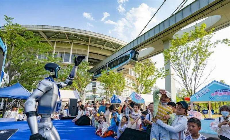 光谷空轨游客与人形机器人互动(图|中国光谷)