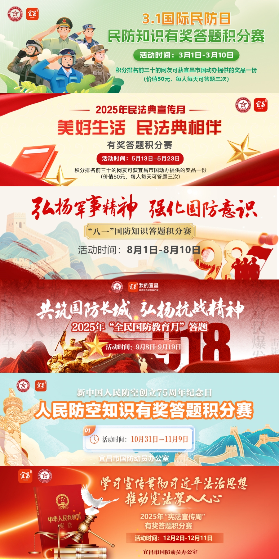 为打破传统普法宣传的单一模式,增强宣传的趣味性和参与度,宜昌市国防动员办公室精心策划系列互动式普法活动。其中,普法灯谜活动以国防法律法规、国防动员知识等为核心内容,让市民在猜谜解谜的过程中潜移默化学习国防知识;6次互动答题活动则聚焦国防安全、国防义务、国防动员相关政策等内容,在全年重要节点:3月1日国际民防日、5月12日全国防灾减灾日、8月1日建军节、9月全民国防教育月、10月31日新中国人民防空创立日、12月4日国家宪法日举办线上答题有奖积分赛,进一步加深群众对国防法治知识的理解与记忆。