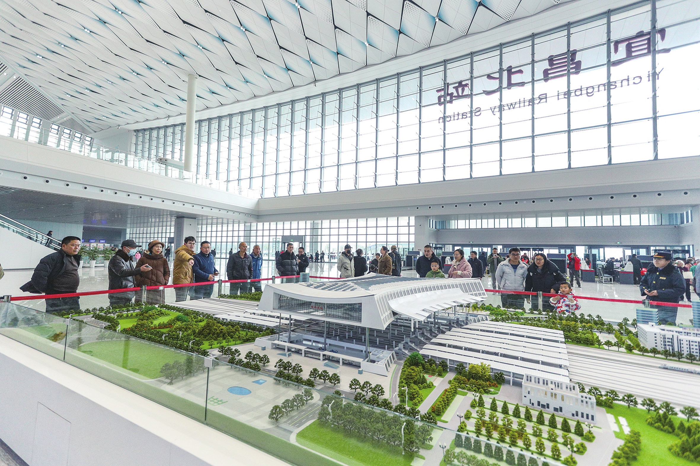 12月20日,宜昌北站在正式开通前举行开放日。众多市民提前探访,体验宽敞明亮的现代化高架候车大厅,了解站内便捷的换乘流线等。(记者林潇 摄)