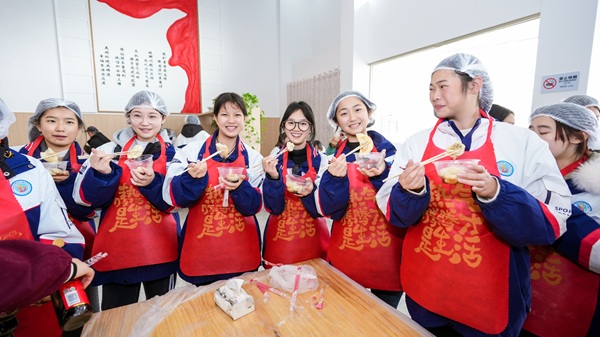 表演结束后,在工作人员引导下,参与者分为十个小组,共同投入包饺子活动。社区居民与民警主动担任“技术指导”,细致讲解步骤、示范技巧,学生们认真聆听、积极动手。在欢声笑语中,各式饺子陆续成型,整齐摆盘。随后,大家围坐在一起,品尝热气腾腾的饺子,分享劳动成果与节日喜悦。(通讯员:郑晓佳、吴春佳)