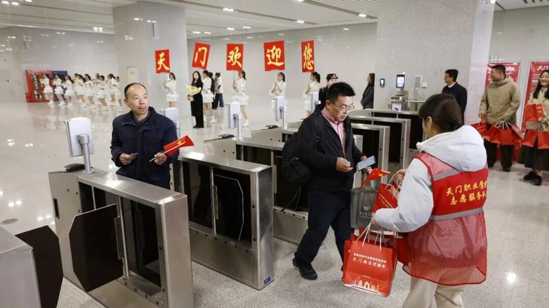 当首批旅客抵达天门站,志愿者热烈欢迎,并送上精心准备的伴手礼。礼盒中,是黄潭米粉、陆羽竟陵红茶叶等天门道地风物。这一深情礼遇,让风尘仆仆的旅客们感受到了“家”的温暖。