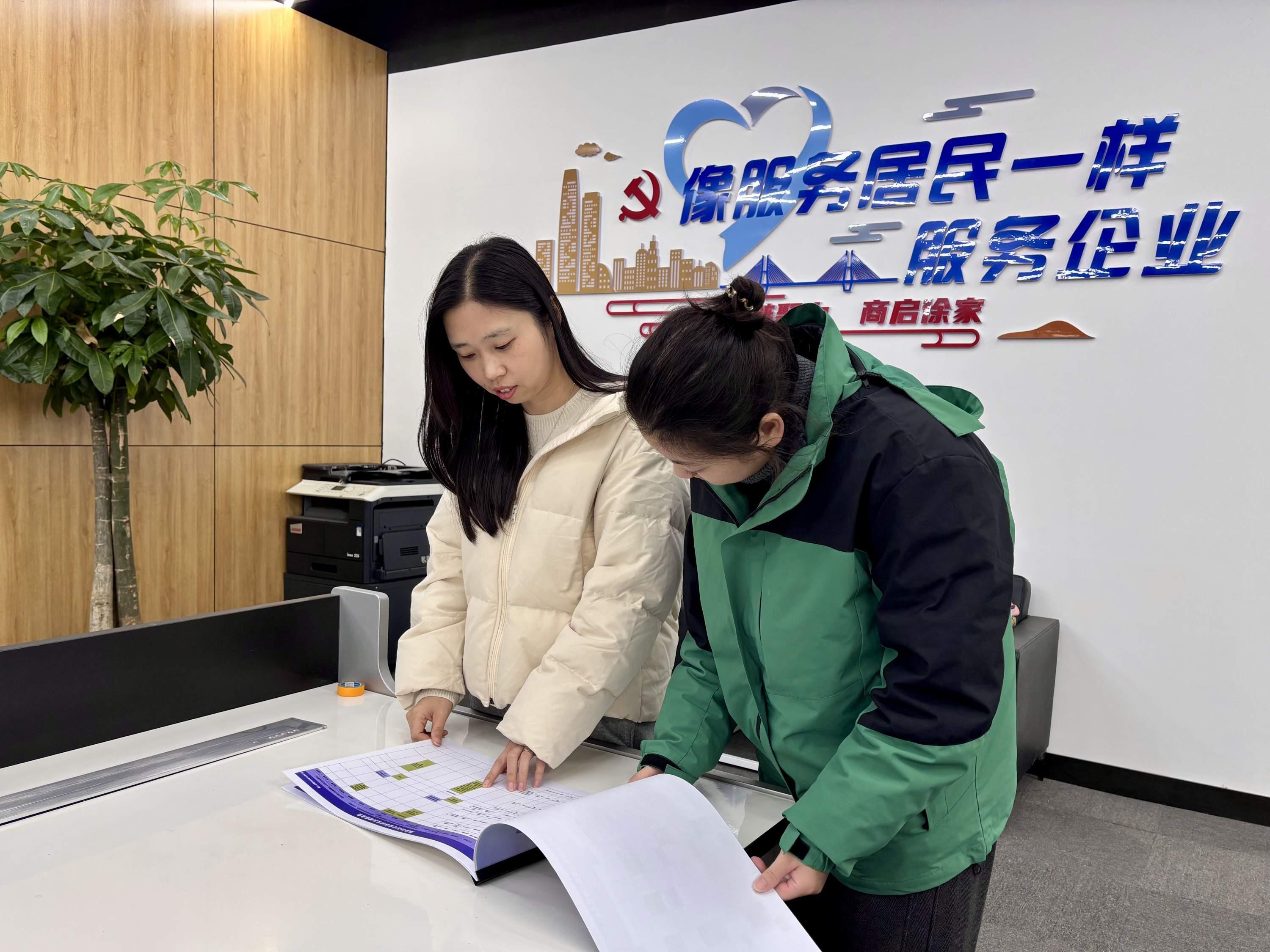 商务社区书记李敏(左)翻阅企业诉求及反馈信息表。栾嘉雯 摄