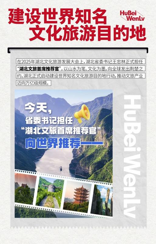 在2025年湖北文化旅游发展大会上,湖北省委书记王忠林正式担任“湖北文旅首席推荐官”,以山水为笔、文化为墨,向全球发出荆楚之约。