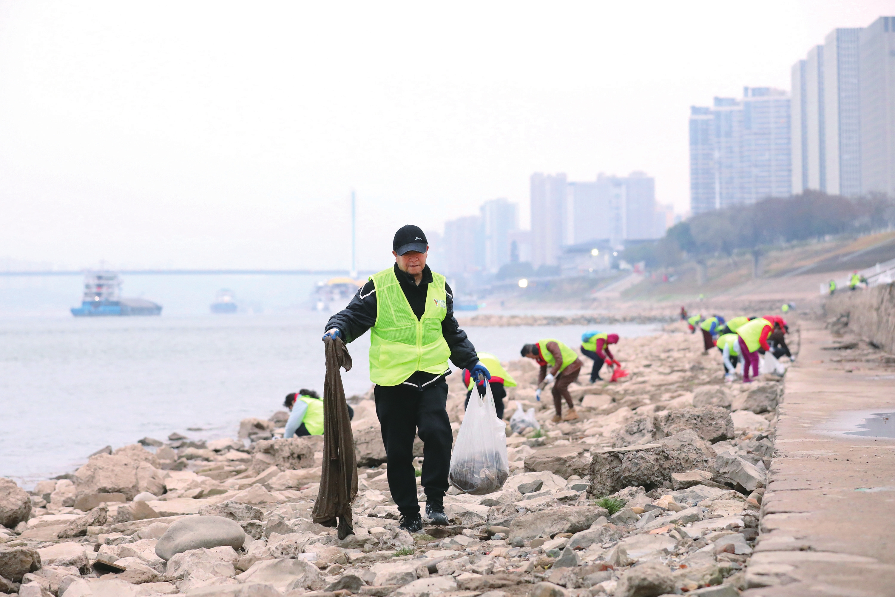 1月1日清晨7时,40余名“三峡蚁工”来到城区长江江滩,开展2026年度第一次净滩活动。元旦期间,有200余名志愿者报名参加“三峡蚁工”连续三天的生态环保公益活动。据了解,“三峡蚁工”10年来累计开展“捡拾江滩垃圾”等生态环保公益活动1250余场次,参与人数逾10万人次。(记者严晓冬 摄)