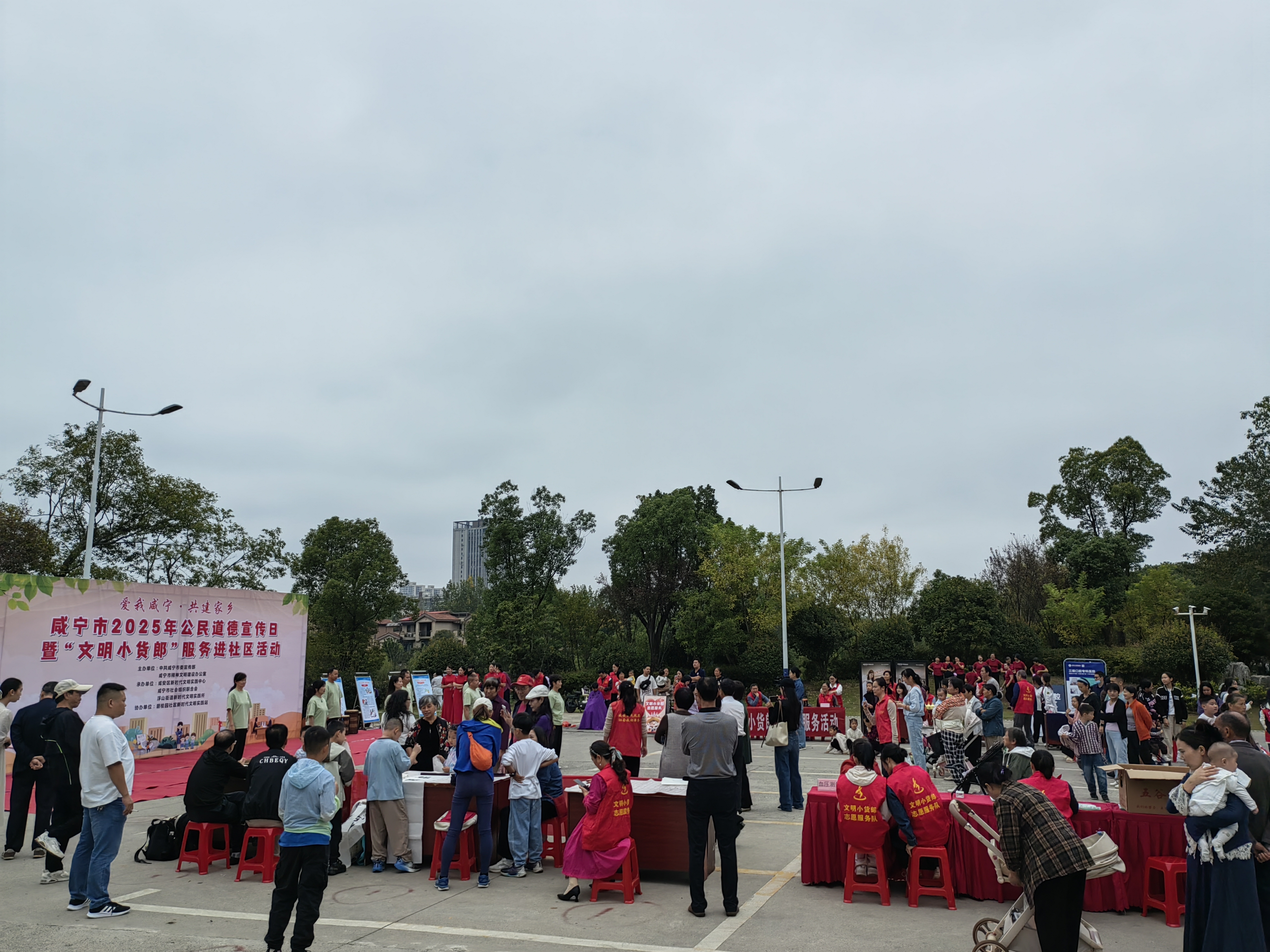 11月22日下午,同惠国际广场上,学府社区联合“文明小货郎”实践项目开展的友邻文化节场面热烈。由咸宁市公关协会、咸宁义工协会、湖科口腔医院、咸宁镇万胜风湿医院等单位组成的“文明小货郎”摊位热闹“开张”。