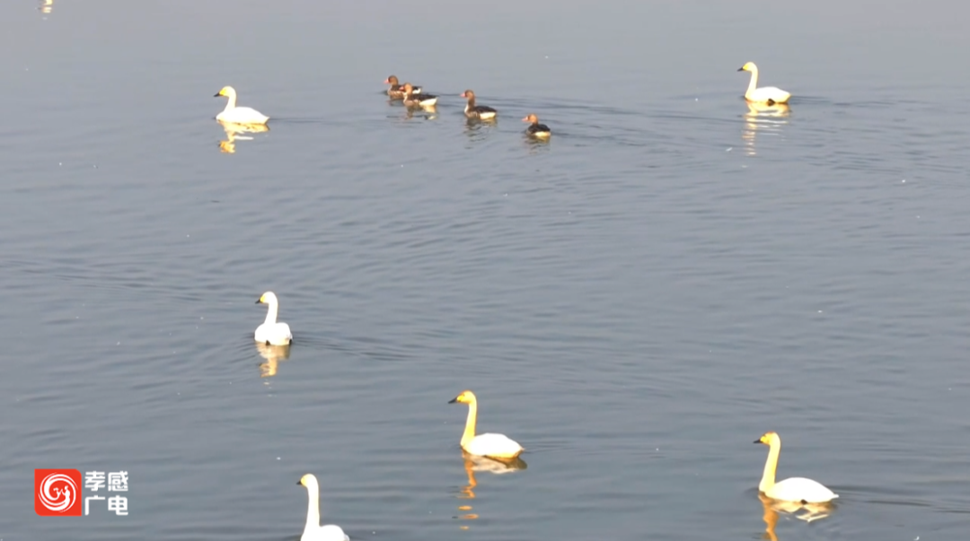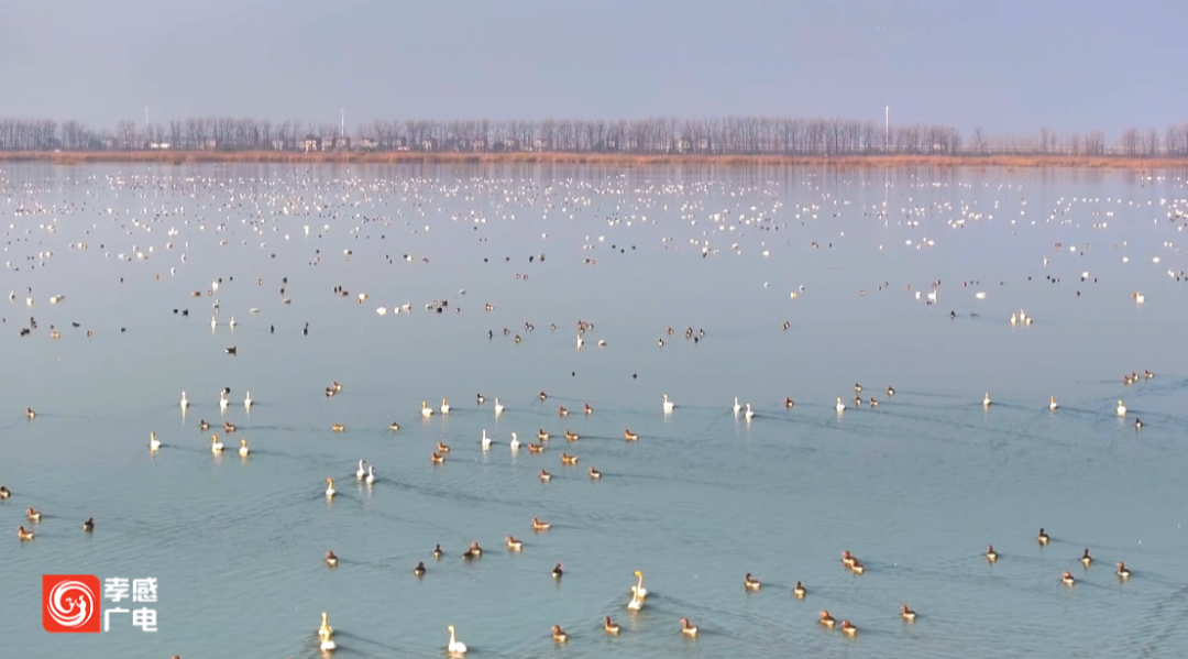 天气渐寒,汉川汈汊湖湿地也迎来了越冬候鸟迁徙高峰。上万只小天鹅、斑头雁等鸟类,在水天一色间翱翔栖息。最高峰时数量超过10万只,越冬水鸟种类已达100多种。
