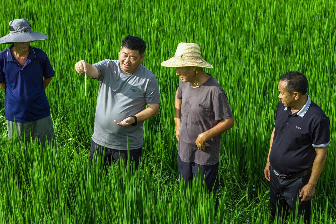 汪宗平在田间给农户示范水稻种植技术。图片来源:宜昌市人大常委会办公室