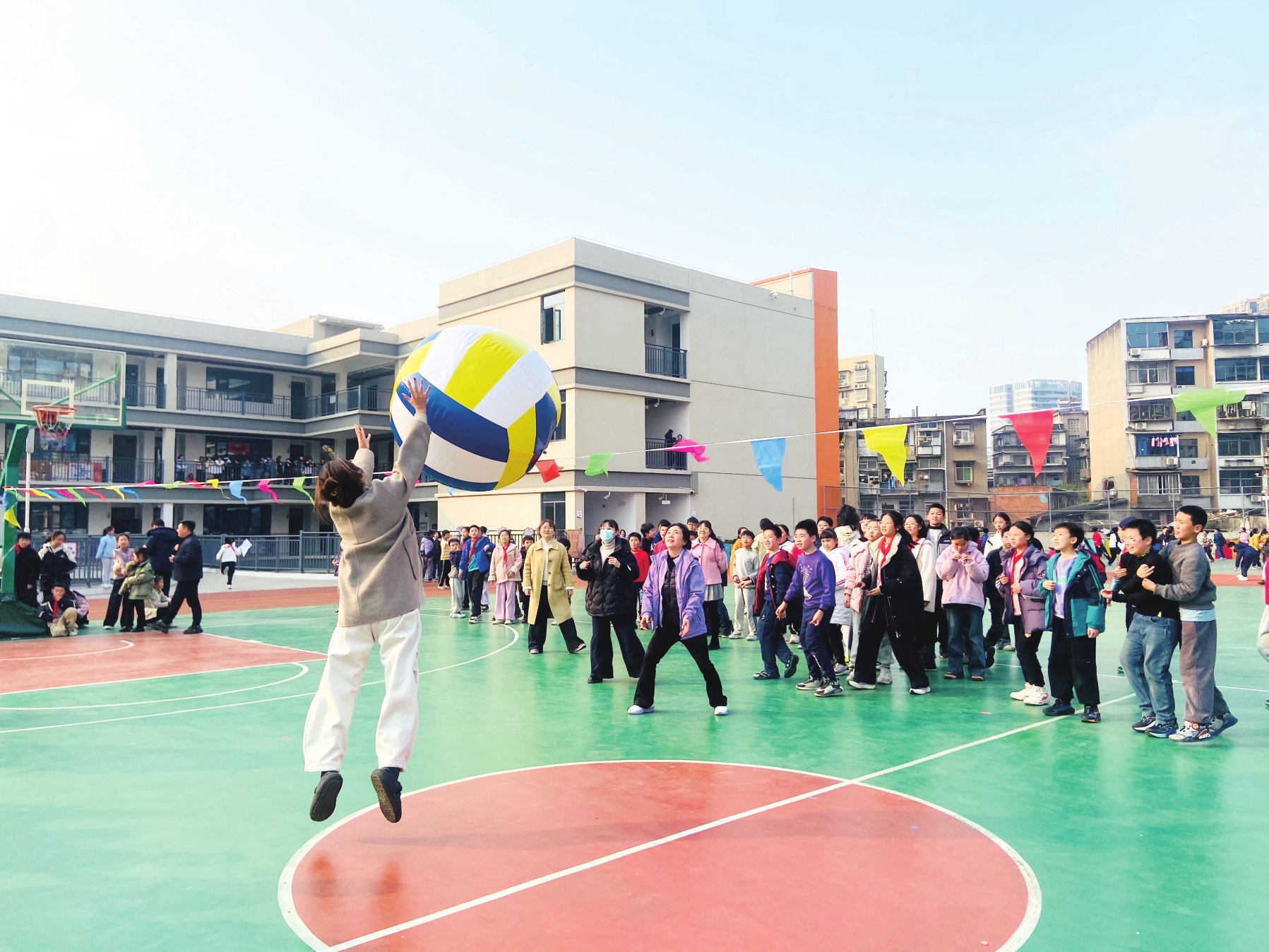 1月14日,在伍家岗区实验小学北山校区,由学校工会组织的大排球活动欢乐启幕,师生踊跃加入,或并肩比拼或呐喊助威,掀起运动热潮。(通讯员王钦昱、向雪 摄)