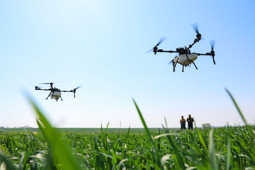 2025年3月20日,在湖北省枣阳市七方镇大房村麦田里,枣阳市顺辉农机专业合作社技术人员操作无人机进行植保作业。新华社发(杨东 摄)