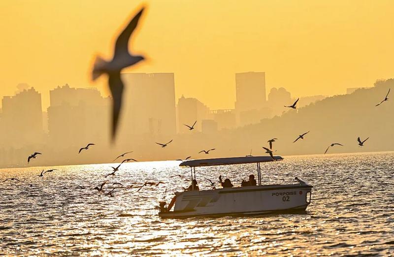 一群大学生在磨山游船上喂红嘴鸥。(朱熙勇|摄)