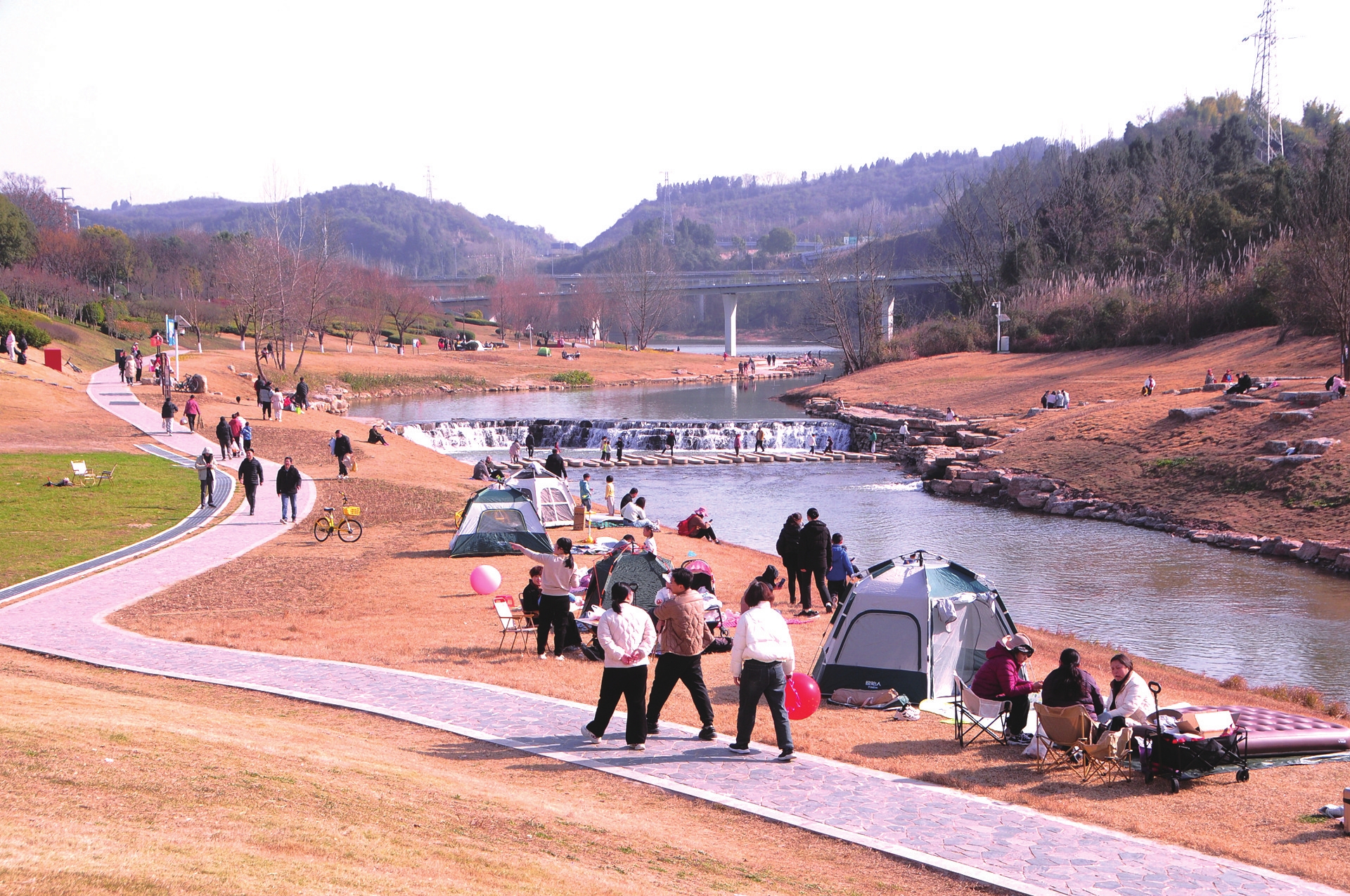 1月17日,众多市民和游客在柏临河湿地公园钢琴坝段游玩、散步、露营,经过整治与保护,这里已经成为深受游客欢迎的打卡地。据了解,近年来宜昌幸福河湖建设让长达13.2公里的柏临河沿线生态环境得到极大提升,实现生态效益与城市功能提升双赢。(记者黄翔 摄)