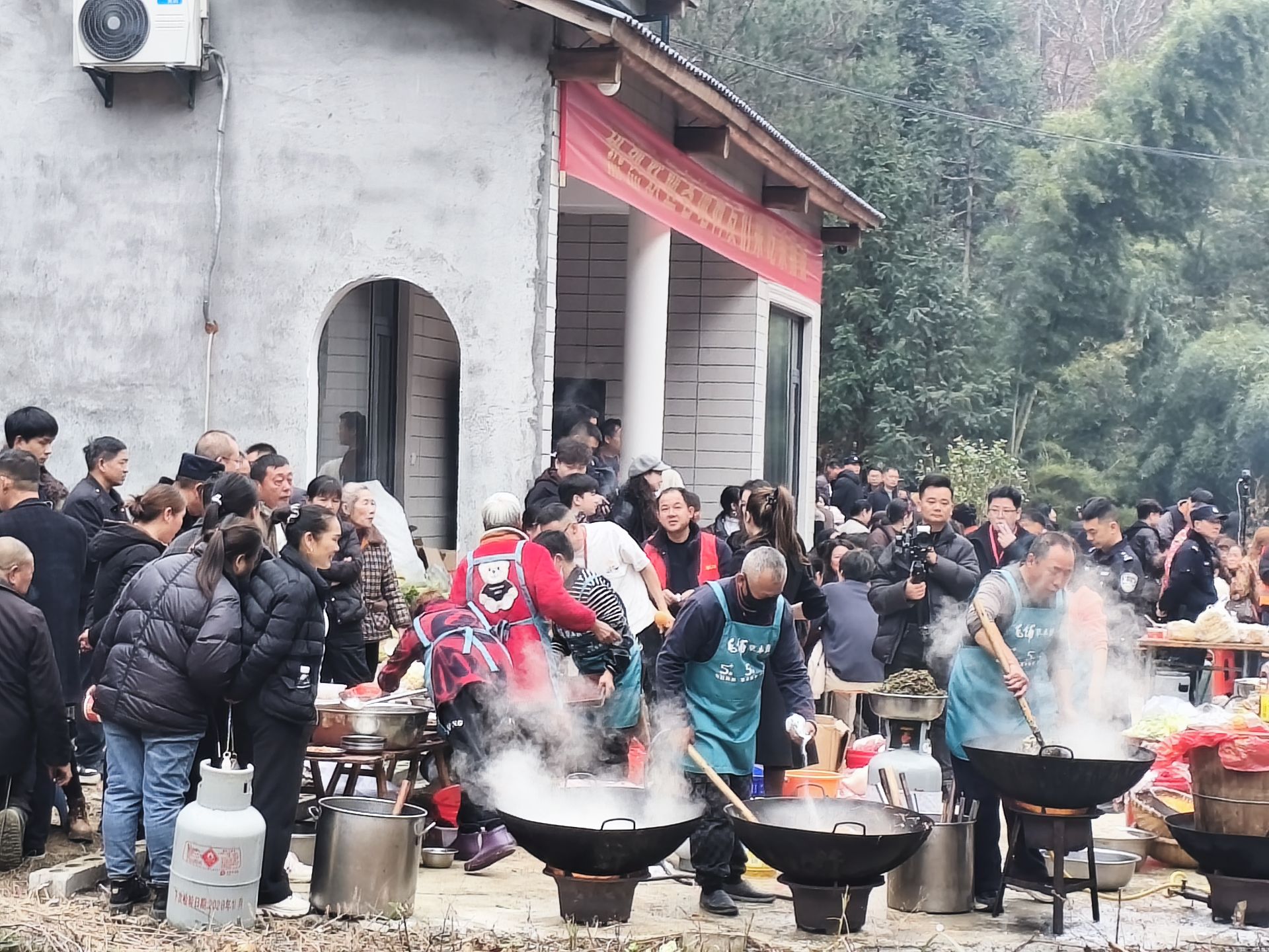 当天,120余名党员干部、志愿者和公安民警悄然进场。他们疏导狭窄山路的交通、引导停车、维持用餐秩序、清理垃圾、解答疑问。村主任汪义兵在北山岩上值守了一整天,连口饭都没顾上吃。还有许多陌生的网友,清晨六点就赶来帮忙杀猪、打扫。