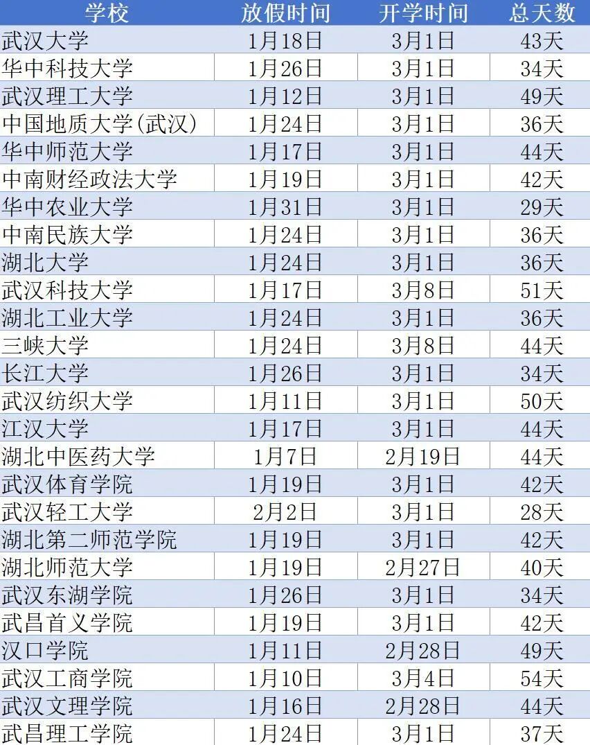 从放假时间来看,最早放假的是湖北中医药大学,最晚的是武汉轻工大学,前后相差近四周。多数高校集中在1月17日至1月26日期间开始放假。据不完全统计,18所高校选择在3月2日正式开始上课,武汉科技大学、三峡大学等少数高校开学时间较晚。寒假总天数方面,武汉工商学院以54天位居榜首,假期最短的则是武汉轻工大学,仅为28天。大部分高校寒假集中在34至44天之间。