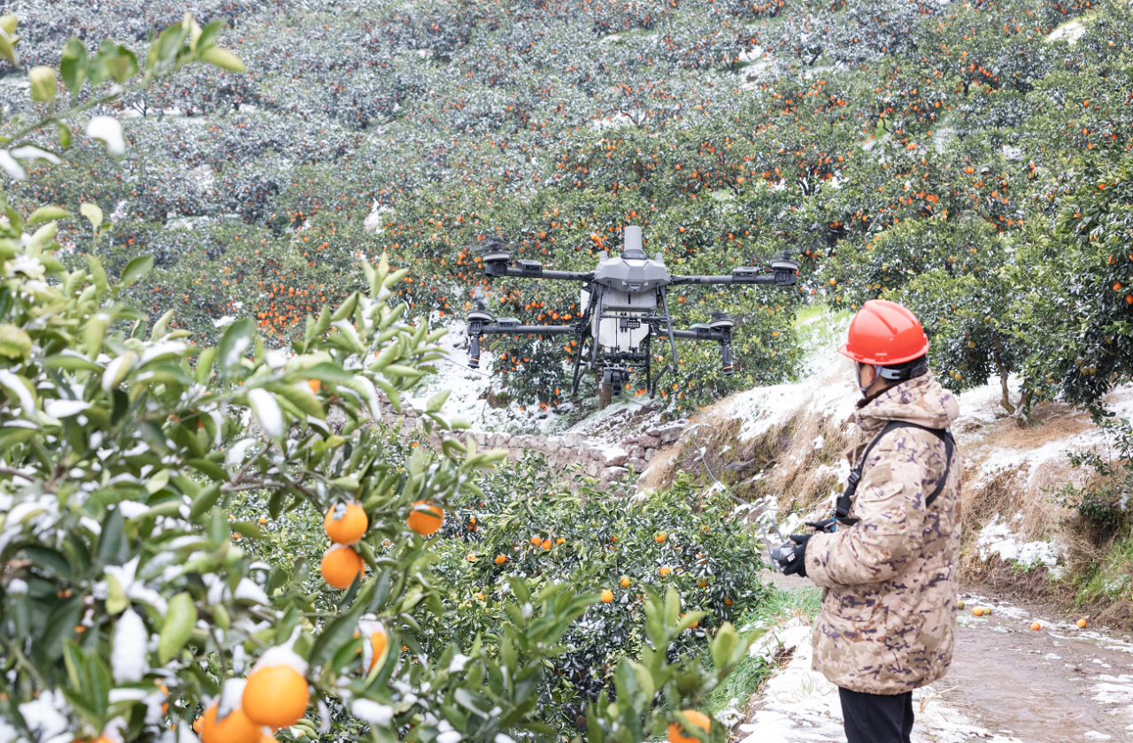 郭家坝镇组织社会化服务组织操作无人机对柑橘树上的积雪进行清除作业。 通讯员 彭强 摄