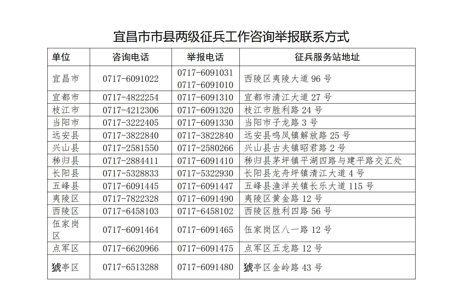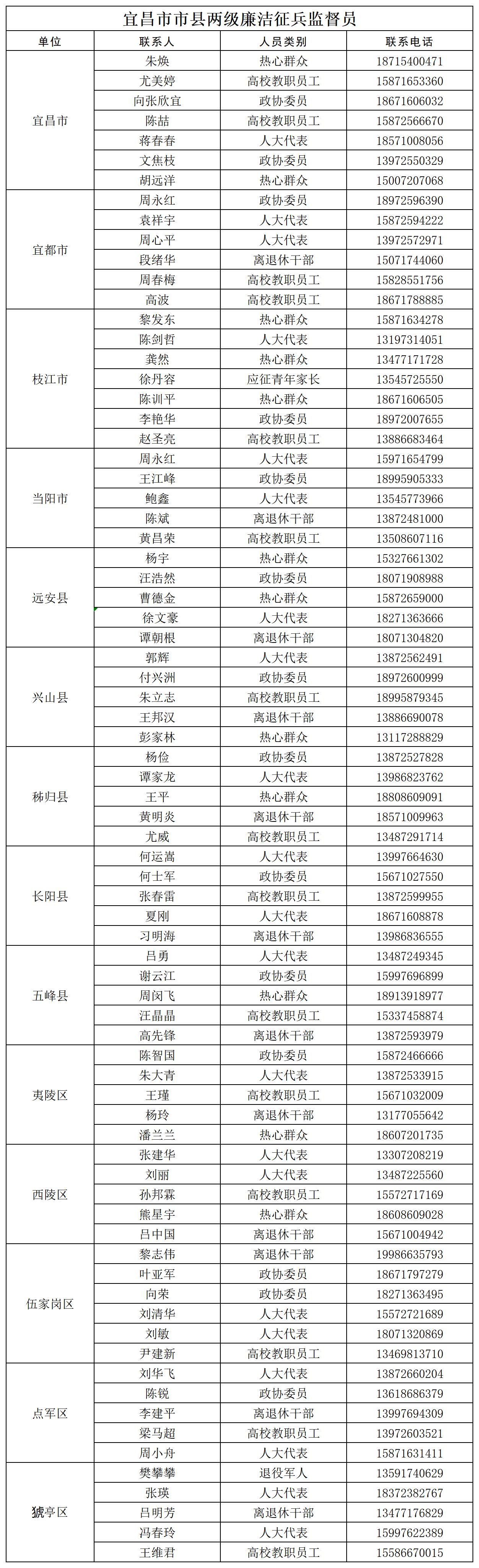 现将宜昌市市县两级征兵办廉洁征兵监督举报联系方式和特聘监督员名单予以公示,欢迎社会各界对征兵工作进行监督。
