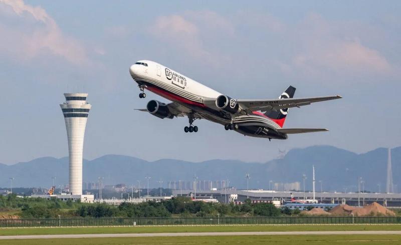 一架B767-300型全货机从鄂州花湖国际机场起飞。(湖北日报全媒记者 薛婷 摄)