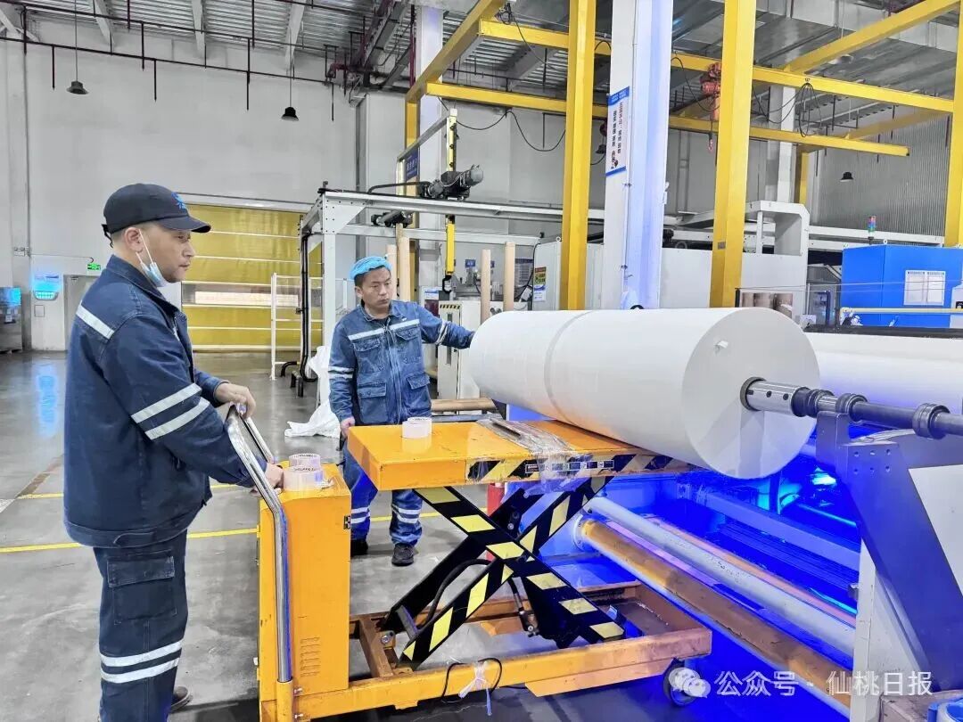 1月25日,拓盈新材料公司生产车间内,建筑防水透气膜生产线24小时不停运转。巨大的卷材不断下线、分切、打包,每天约40吨产品从这里发往欧美、日韩市场。电话那头,市非织造布产业青年科技突击队队员、拓盈新材料公司研发质量经理张继文一刻不停歇。