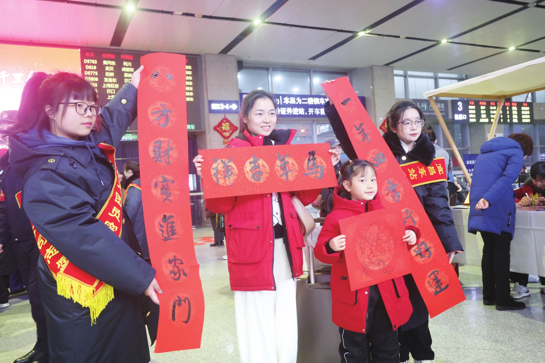 2月2日,宜昌市文联(作协)“百花”志愿服务团周德聪、金强、任晓明等书法家来到宜昌东站,为旅客书写春联,送上新春祝“福”,现场旅客纷纷为宜昌的温暖点赞。(记者吴延陵 摄)