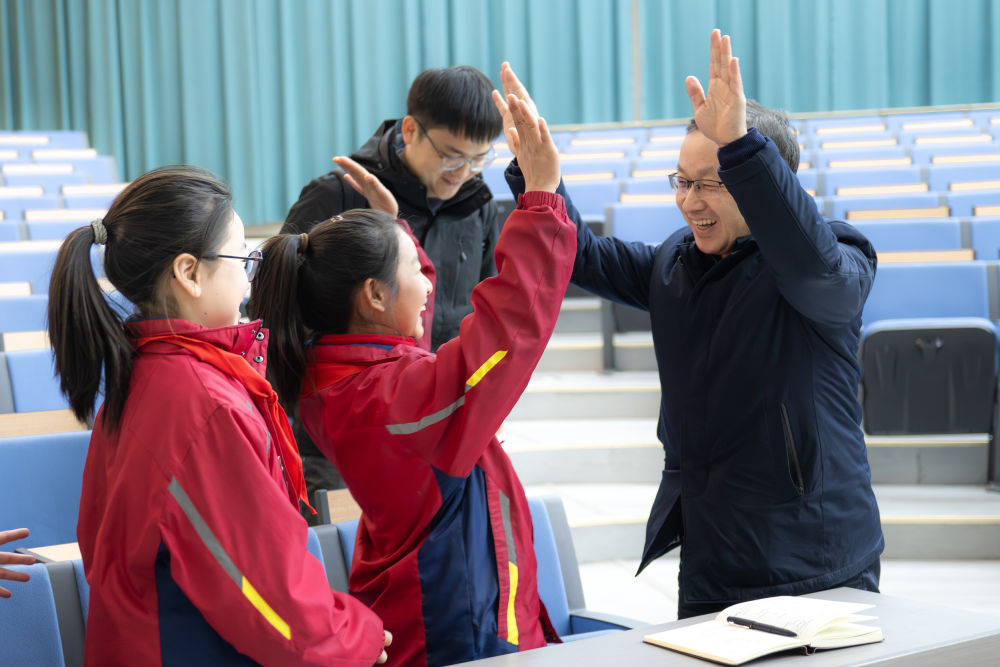 在红安县将军城小学,记者与参加思政示范课的小学生击掌互动。新华社记者 肖艺九 摄
