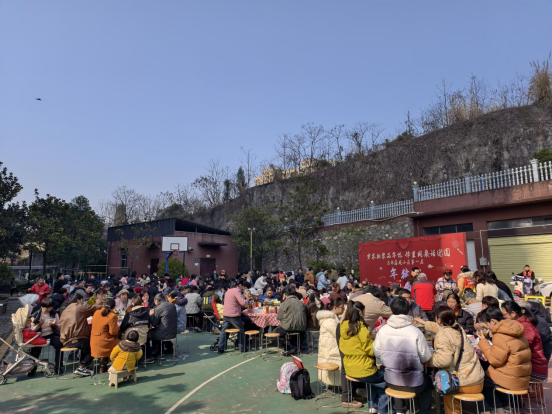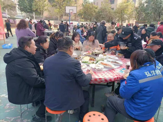2月2日,农历腊月十五,西陵区窑湾街道朝阳路社区总部鑫苑小区的篮球场热闹非凡。二十张圆桌座无虚席,空气中蒸肉的醇香、炖汤的热气与百家菜的香气交织——小区首届年猪宴在冬日的暖阳中开席了。