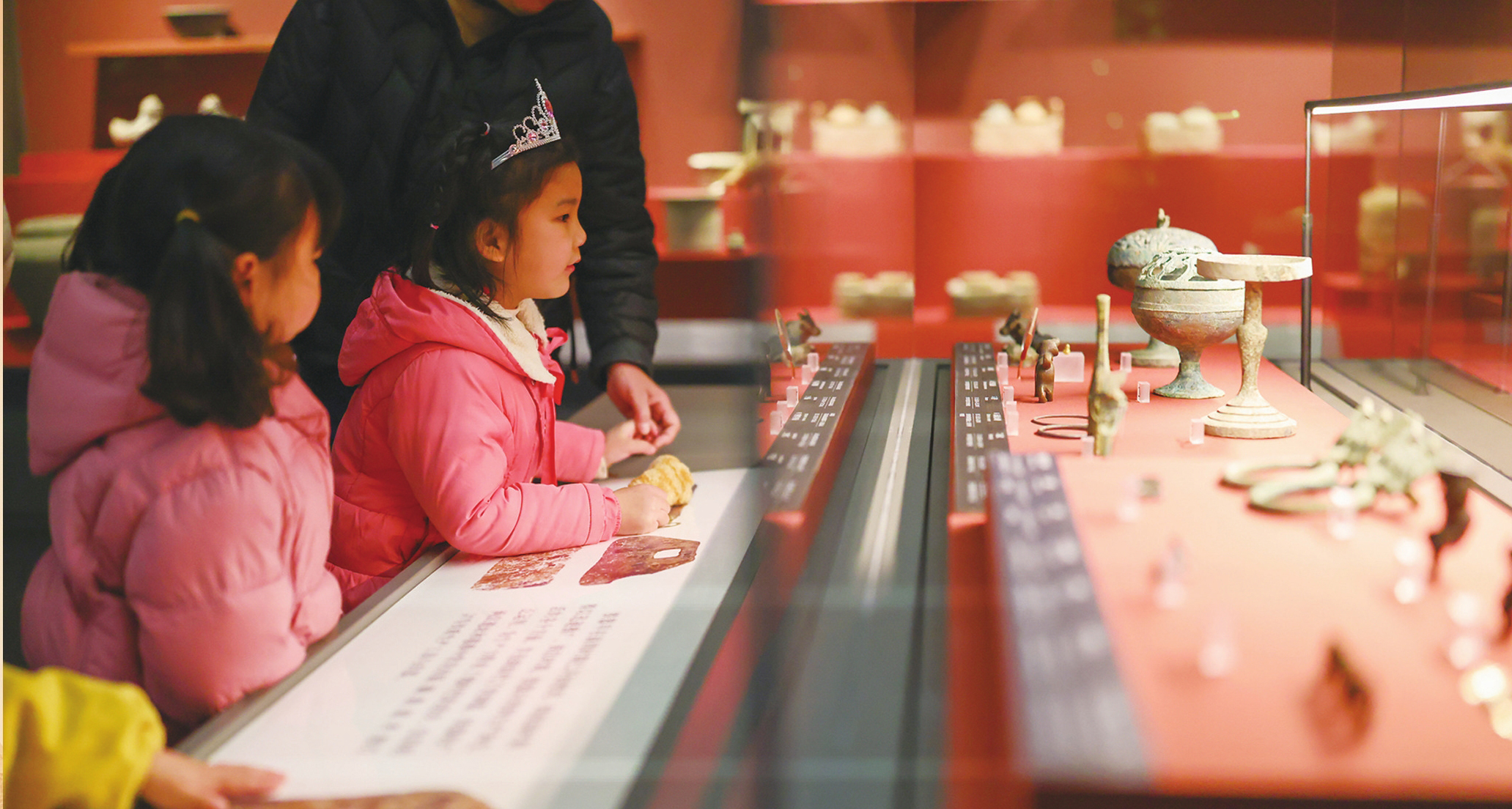 2月5日,众多小朋友在家人陪伴下走进市博物馆度过寒假时光。他们仔细观赏本地出土的青铜器、陶俑等珍贵文物,聆听生动讲解,亲身感受家乡深厚的历史文化底蕴。(记者林潇 摄)