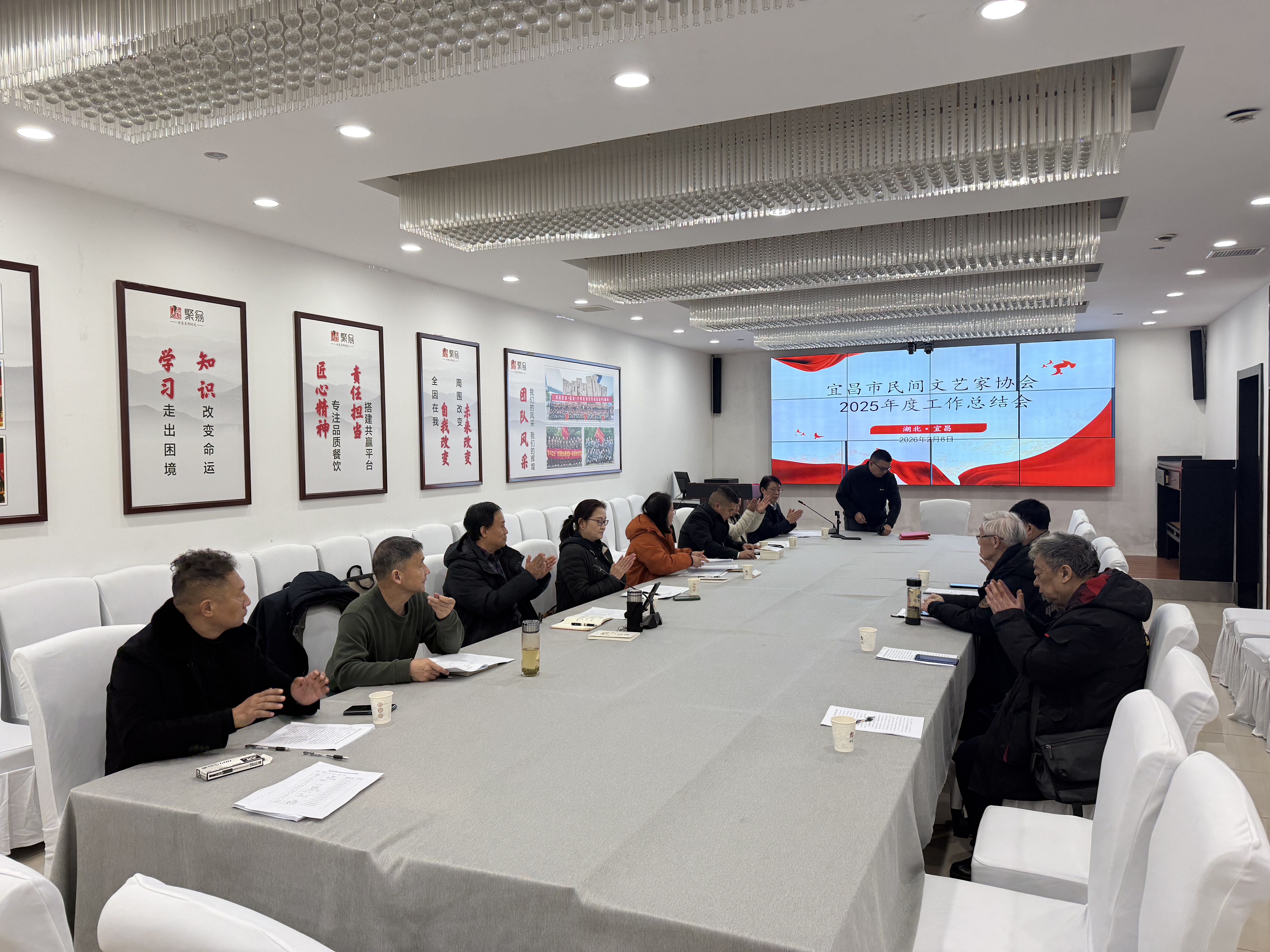 2月8日,宜昌市民间文艺家协会2025年度工作总结会在市文化名家王作栋工作室召开,主会场与腾讯会议线上分会场同步联动,省民协副主席黄贞进、市文联四级调研员李树荣、市民协主席团成员、专家顾问王作栋、熊庆文及各县市区民协代表齐聚一堂,共同回顾2025年民间文艺事业发展成果,擘画2026年发展新蓝图。省民协副主席黄贞进领学相关会议和文件精神,宜昌市民间文艺家协会主席余远国作总结报告,市民协副秘书长张远刚主持会议。宜昌三峡电子音像出版社社长付章良现场见证了《“宜昌人生——城市记忆传承出版工程”项目合作协议》签约仪式,该项目将为宜昌民间文化传承注入新动能。