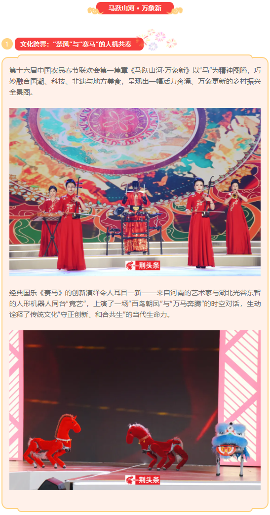 晚会由激昂欢腾的《福马驰骋迎新春》片头拉开序幕,紧随其后的是开场歌舞《马踏春风祥瑞来》,以“马”为意象,寓意乡村振兴一马当先、奋蹄向前。