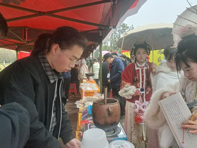 文创市集与地标优品展销区同样人流如织。“织梦坊”残疾人文创、安国寺文创、东坡主题文创产品琳琅满目;武穴酥糖甜香四溢。区书画诗联协会与宝塔社区的送春联活动累计创作百余副,吸引不少游客驻足求赠。李新军的小吃摊位前,米酒、藕夹、肉丸热气腾腾,亲民的价格与地道的风味广受欢迎。“能让大家感受黄州小吃和东坡文化的烟火气,我很开心。”李新军笑道。