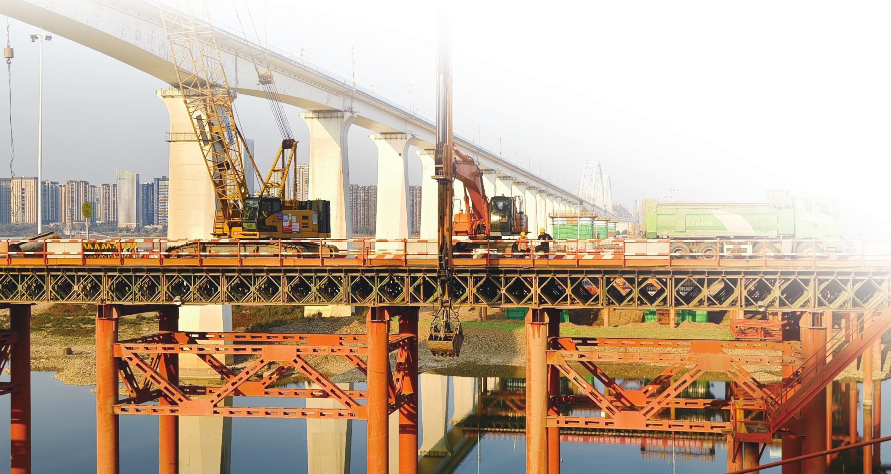 2月24日,宜涪高铁宜昌长江公铁大桥建设马不停蹄,主塔桥墩的塔座、塔柱正在加紧施工。(记者吴延陵 摄)