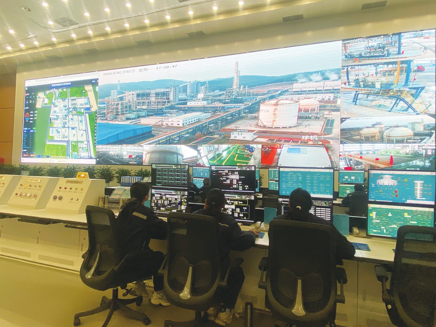 2月24日,当阳坝陵化工园湖北晋控气体有限公司中控室内,操作人员查看各项数据。 (记者尤蔓、通讯员田野 摄)