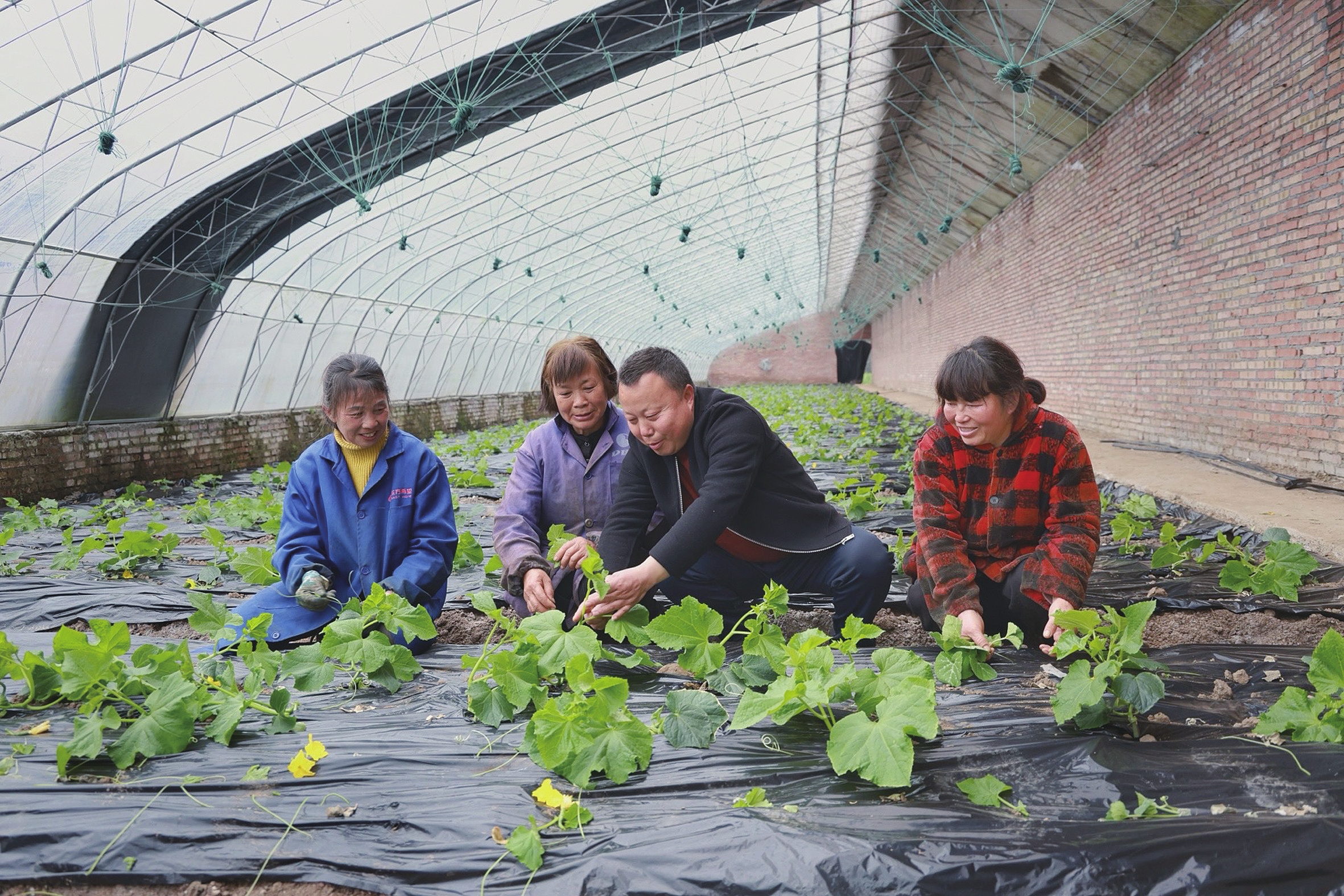 2月24日,夷陵区鸦鹊岭镇金和村,农技专家赵秀卓(右二)正在大棚里指导村民养护黄瓜苗。