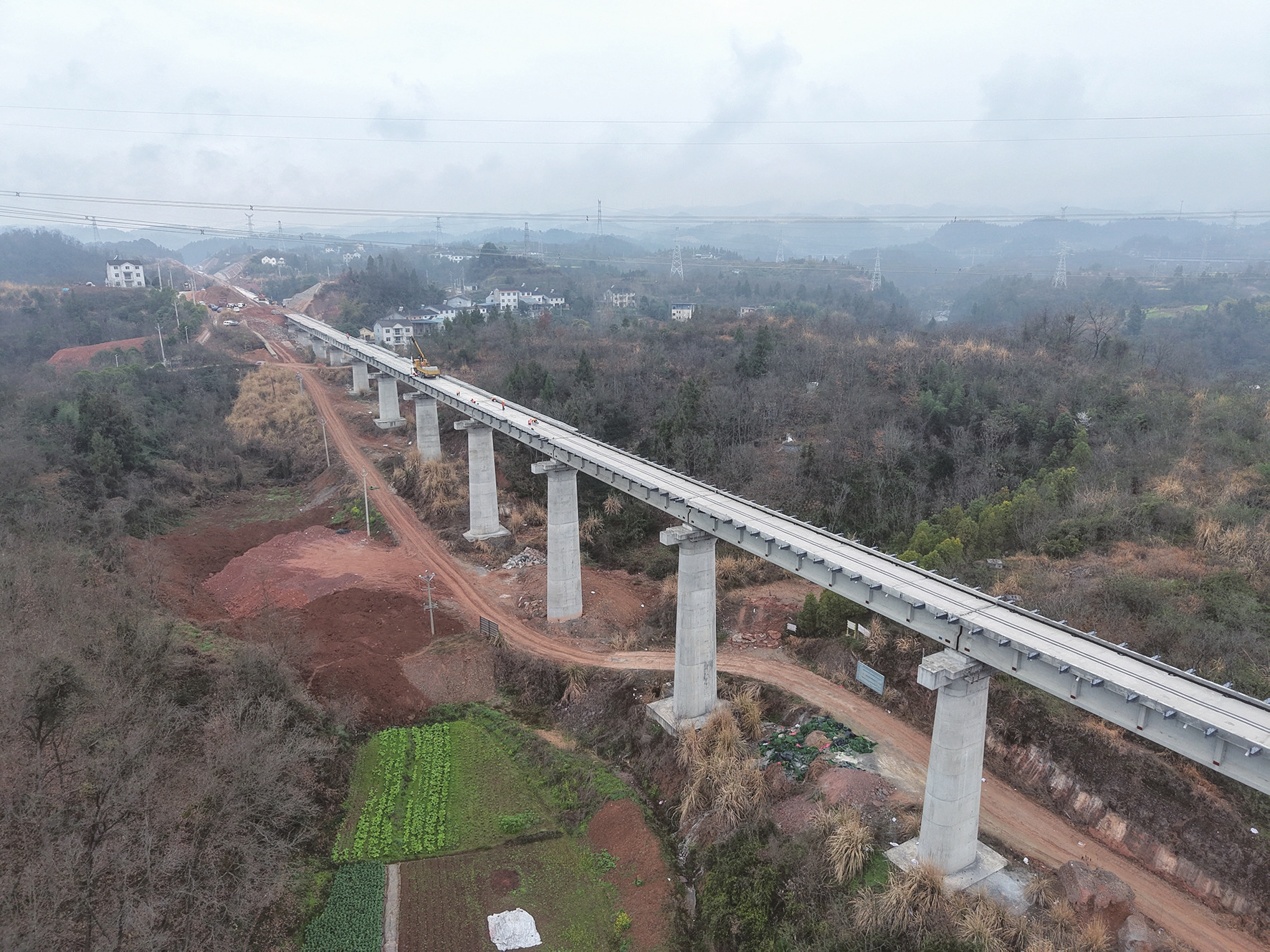 站在太平村特大桥上望去,已经贯通的桥梁像一条灰色的长龙,蜿蜒在初春的山谷里。桥下,枯木发出新芽。桥面上,工人们正忙着浇筑、安装、测量。