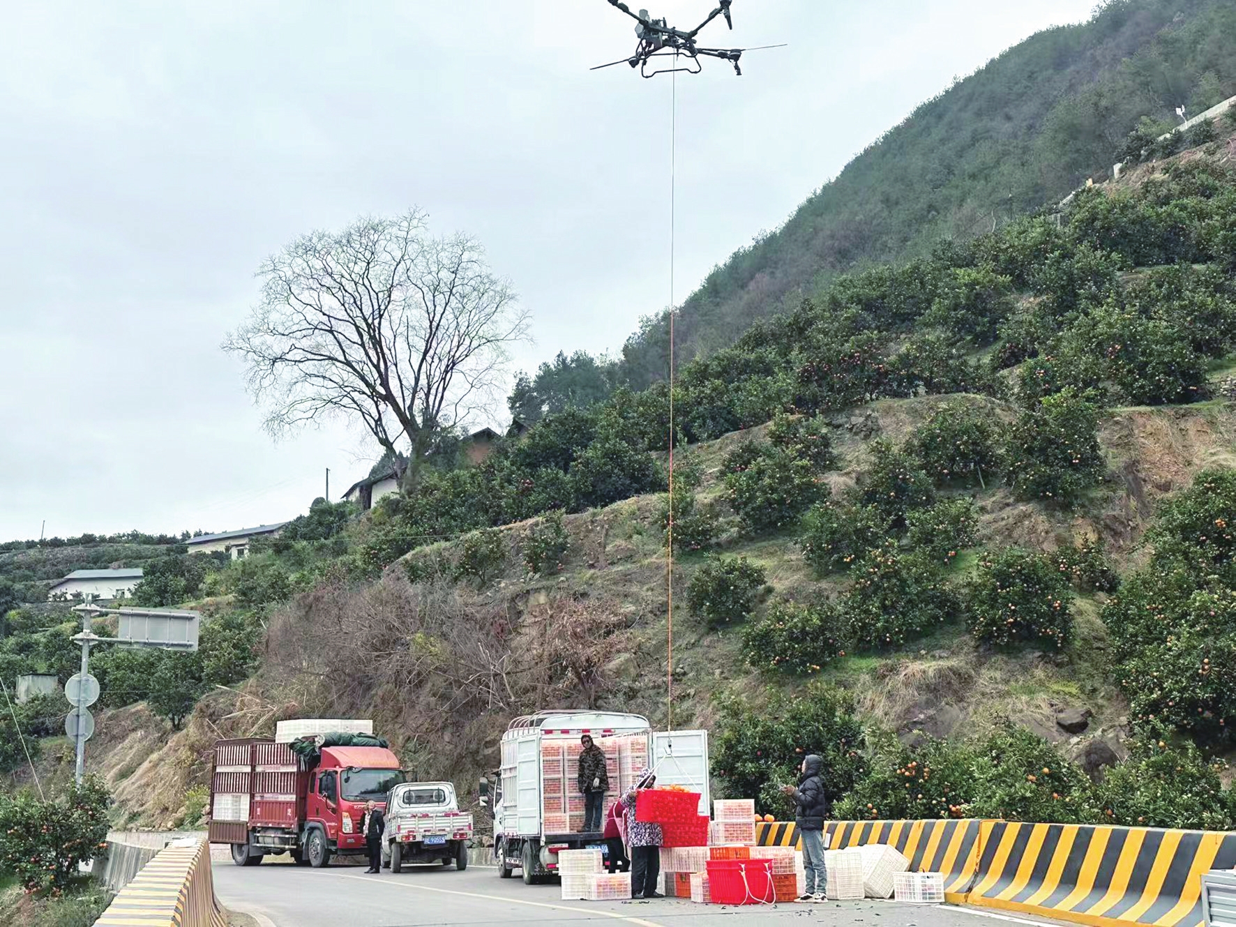 2月27日,安合生态农业公司的飞手团队在秭归县沙镇溪镇进行橙子吊运作业。 (图片由受访者提供)
