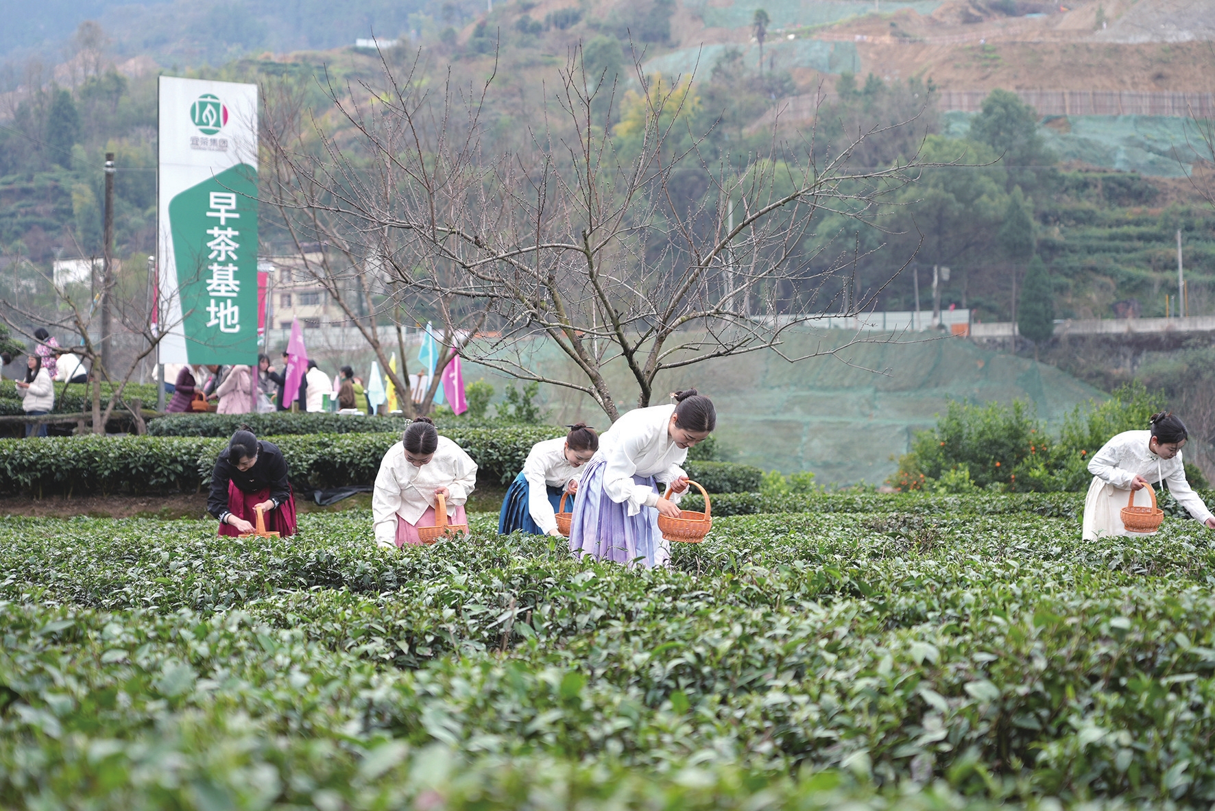 2月27日,宜茶集团早茶基地秭归县茅坪镇中坝子村茶园抢“鲜”开园,当地茶农、茶企抢抓春日先机,以一叶鲜茗唤醒峡州春意。(记者谭杨晨雷 摄)