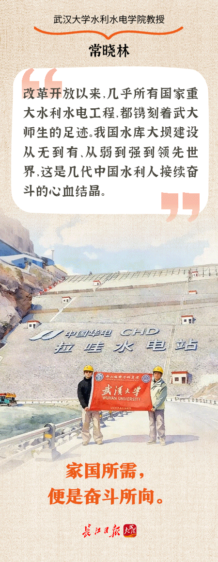 家国所需,便是奋斗所向。“改革开放以来,几乎所有国家重大水利水电工程,都镌刻着武大师生的足迹。我国水库大坝建设从无到有、从弱到强到领先世界,这是几代中国水利人接续奋斗的心血结晶。”武汉大学水利水电学院教授常晓林说。