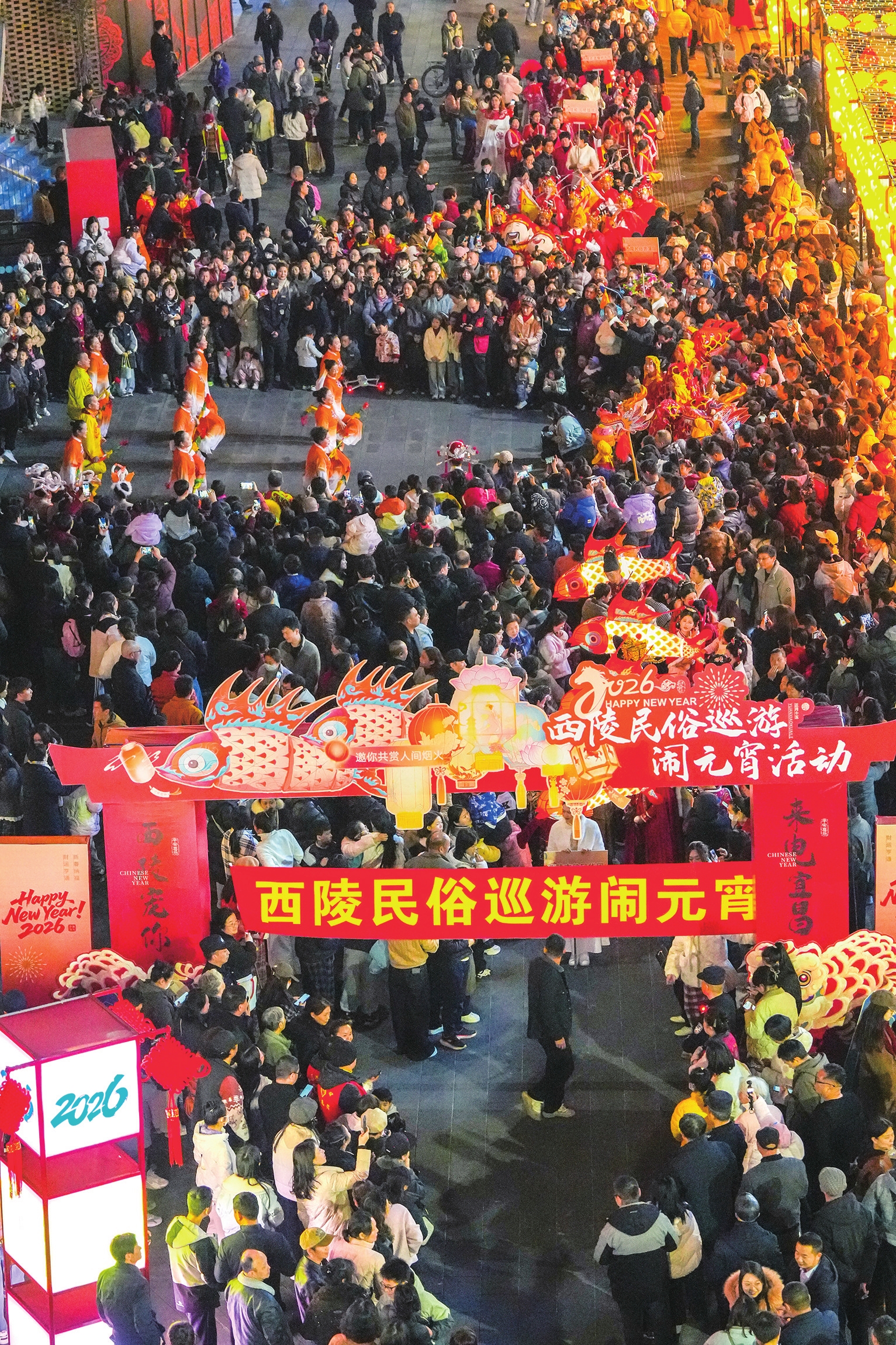 3月3日晚,西陵区民俗巡游闹元宵活动在宜昌城区举行。伴随“咚咚锵”的锣鼓声,舞龙、舞狮在腰鼓队、提灯队的簇拥下,从二马路出发,途经滨江公园、陶珠路夜市、解放路等地,最后到达儿童公园西门。(记者严晓冬 摄)