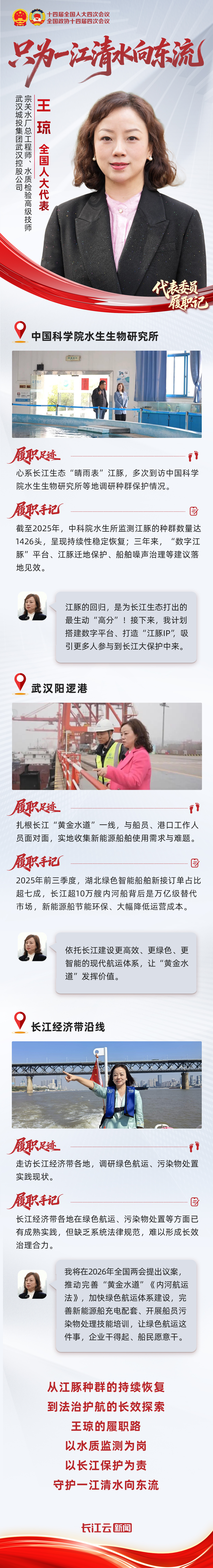 春潮涌动处,奋进正当时,2026年全国两会即将到来。即日起,长江云新闻联合市县区融媒体中心推出系列报道《代表委员履职记》,看代表委员们如何不辱使命,履职担当。今天,让我们一同走近全国人大代表王琼,见证她以水质监测为岗、以长江保护为责,守护一江清水向东流。
