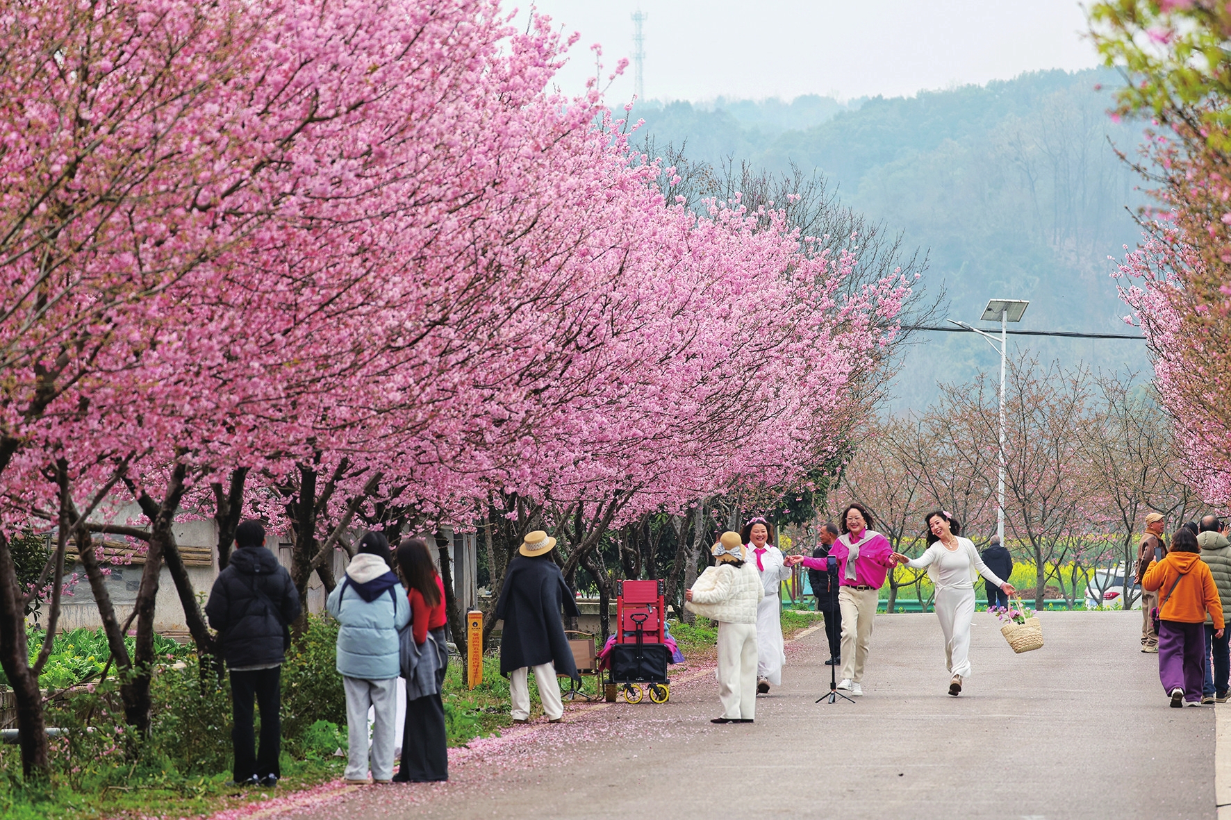 3月3日,游客在宜都市枝城镇洋津畈村赏花。该村4800株樱花已进入最佳观赏期,包括富士樱、垂枝樱、寒绯樱等多个品种,花海连绵如云霞铺展,吸引了不少游客踏青打卡。(记者黄翔 摄)