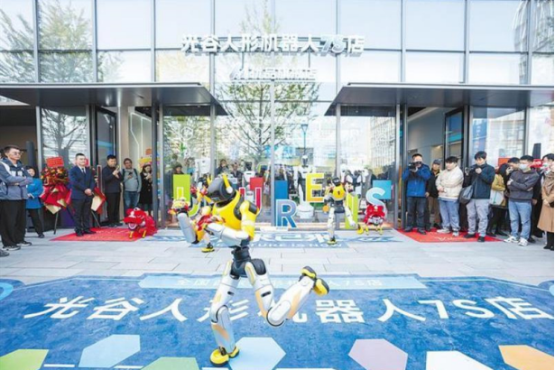 (人形机器人在机器人7S店门前表演)