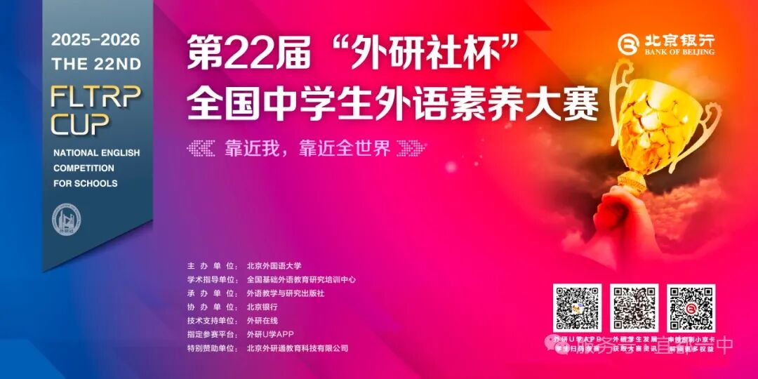 “外研社杯”全国中学生外语素养大赛由北京外国语大学主办、外语教学与研究出版社承办,连续多年入选教育部全国性竞赛活动名单,是面向高中学生举办的权威公益赛事。